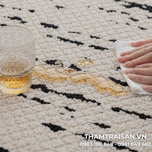 Khi nước hoặc đồ uống bị đổ lên thảm, bạn chỉ cần dùng khăn khô hoặc giấy thấm để lau sạch. Ngoài ra, thảm cũng có thể được hút bụi định kỳ để loại bỏ bụi bẩn và giữ cho bề mặt luôn sạch sẽ.