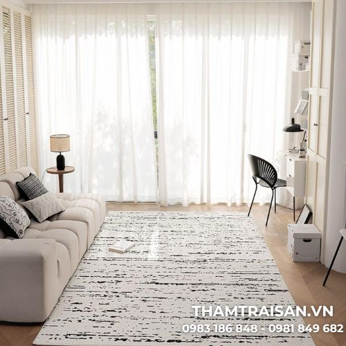 Với gam màu kem kết hợp họa tiết đen hiện đại, mẫu thảm này dễ dàng hòa hợp với nhiều phong cách nội thất khác nhau từ tối giản đến hiện đại. Khi đặt trong phòng khách, thảm không chỉ giúp không gian trở nên sang trọng hơn mà còn tạo cảm giác gọn gàng và hài hòa.
