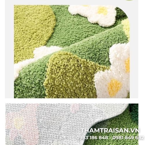 Khác với các loại thảm truyền thống có hình dạng vuông hoặc chữ nhật đơn giản, mẫu thảm Derco gây ấn tượng mạnh nhờ thiết kế mô phỏng thảm cỏ xanh với các bông hoa nổi 3D. Các mảng màu xanh đậm – nhạt được phối hài hòa, tạo cảm giác như một khu vườn nhỏ ngay trong phòng khách.