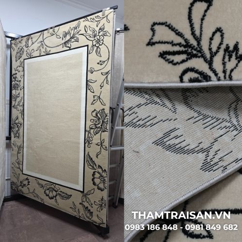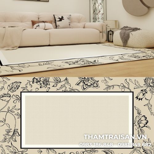Bên cạnh đó, chất liệu sợi cao cấp giúp thảm êm ái khi sử dụng, dễ vệ sinh và phù hợp với gia đình có trẻ nhỏ hoặc người lớn tuổi. Hoa văn viền nghệ thuật tạo điểm nhấn vừa đủ, không làm mất đi sự trang nhã của không gian.