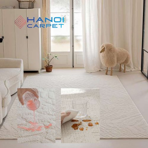 Điểm đặc biệt của dòng thảm này nằm ở cấu trúc sợi và lớp đế thông minh giúp hạn chế nước thấm vào bên trong. Nhờ vậy, các vết nước, nước ngọt hoặc cà phê có thể được lau sạch nhanh chóng mà không để lại dấu vết. Đây chính là lựa chọn lý tưởng cho những gia đình yêu thích sự tiện nghi nhưng vẫn muốn giữ được vẻ đẹp thẩm mỹ cho không gian.